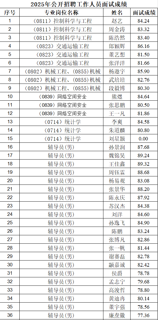 根据《洛阳铁路信息工程学校2025年公开招聘工作人员公告》,我校于2026年1月18日组织了面试工作,现将面试成绩予以公示,公示期为2026年1月18日—2026年1月20日,具体成绩如下。