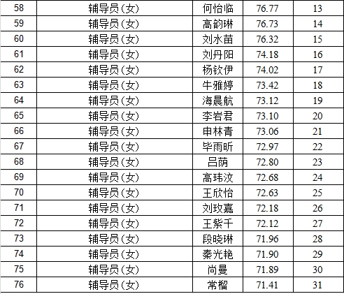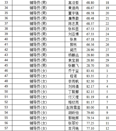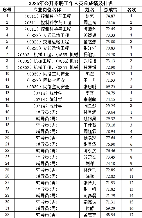 根据《洛阳铁路信息工程学校2025年公开招聘工作人员公告》,现将学校2025年公开招聘工作人员总成绩(考试总成绩=笔试成绩×50%+面试成绩×50%)及排名予以公示,公示期为2026年1月18日—2026年1月20日。总成绩及排名如下。