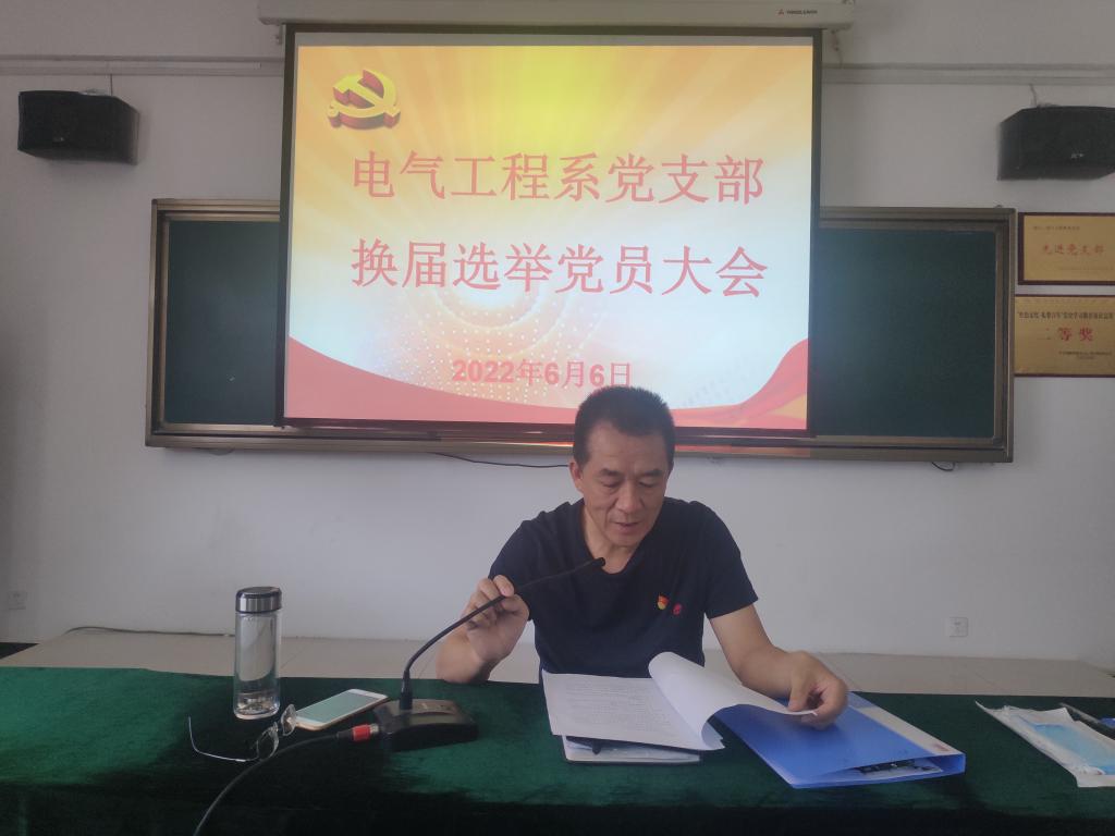 根据校党委统一部署,6月6日下午,电气工程系党支部在338党员活动室召开党支部换届选举党员大会,此次会议主要选举产生新一届支委委员,全体党员参加会议,会议由电气工程系党支部书记、系主任段云冬主持。